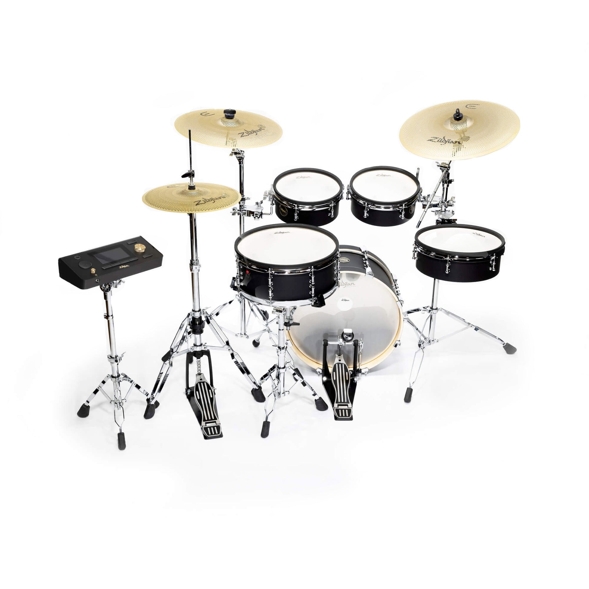 • Revolutionary E-FAMILY Cymbals - 14” HiHats / 16” Crash / 18” Crash Ride. All feature built-in Zildjian™ Trigger System, 3-zone playability, and 360° touch choking.
